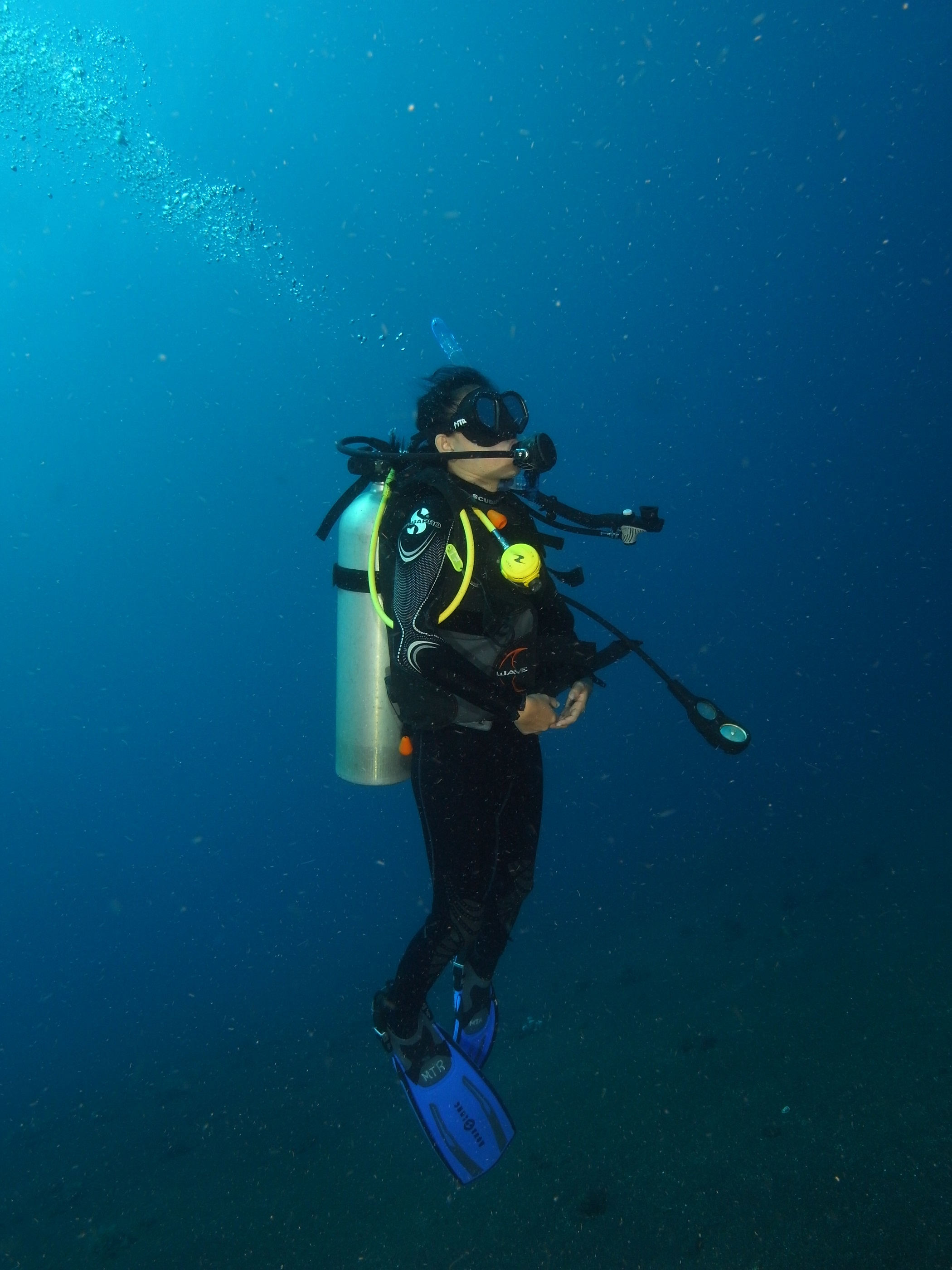 Hari kedua langsung nyebur kelaut.. hari ini 3x penyelaman dengan kedalaman 12-18 m dan wkt penyelaman masing2 sekitar 45 menit. Selain mengulang semua pelajaran kemarin, tentu aja menikmati biota laut. Yooo kita liat ke bawah laut… Ada karang, penyu, ikan napoleon dan sepasang hiu sirip hitam yg masih kanak2.. 😀